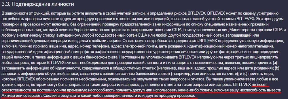 Махинаторы Бит Левекс предусмотрели верификацию и используют ее для того, чтобы обчищать депозиты. Причем жаловаться на это бесполезно - все предусмотрено в соглашении.