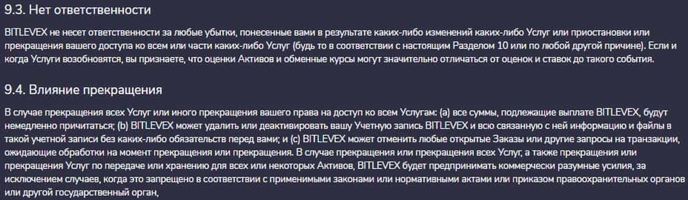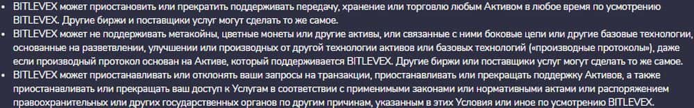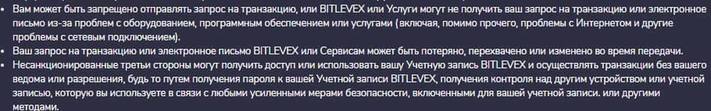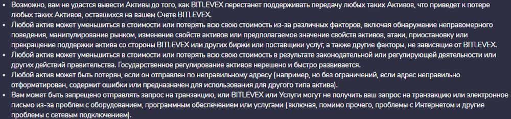 Следующий пункт в соглашении шарлатанов Бит Левекс посвящен тому, что любой актив может быть утерян (как это вообще) или обесценен, и контора ответственности за это не несет.