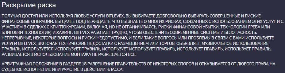 Клиентское соглашение в исполнении спекулянтов Бит Левекс - сплошной отказ от ответственности. Они сразу предупреждают трейдеров, что те могут потерять все деньги.