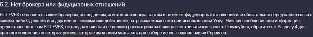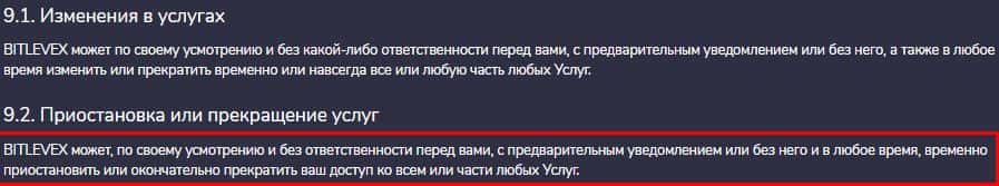 Мошенники Бит Левекс в клиентском соглашении оставляют за собой право игнорировать ордера, отклонять транзакции по своему усмотрению и блокировать доступ инвесторам.