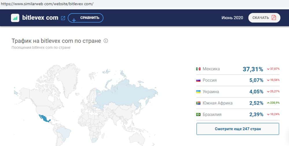 Ресурс similarweb com показывает, что мошенники BitLevex получают трафик в основном из Мексики, но уже начинают "просачиваться" в Россию, Украину, Южную Африку и Бразилию.