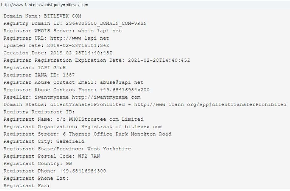 Согласно данным сервиса 1api net, на базе которого зарегистрирован домен bitlevex com, принадлежащий скам-конторе Бит Левекс, его владельцы предпочли сохранить анонимность.