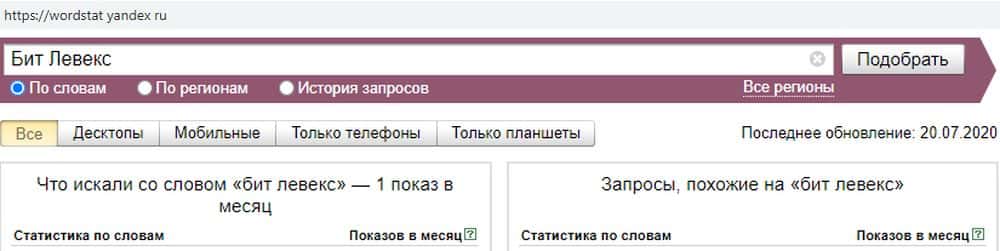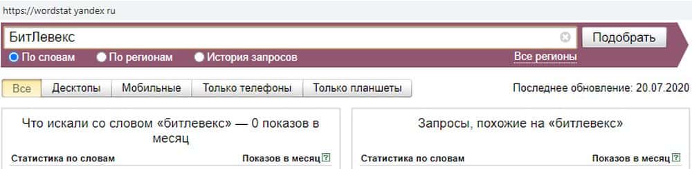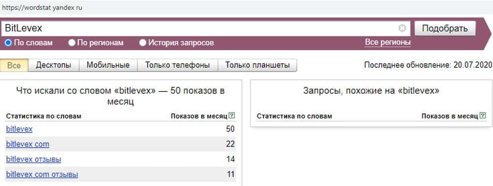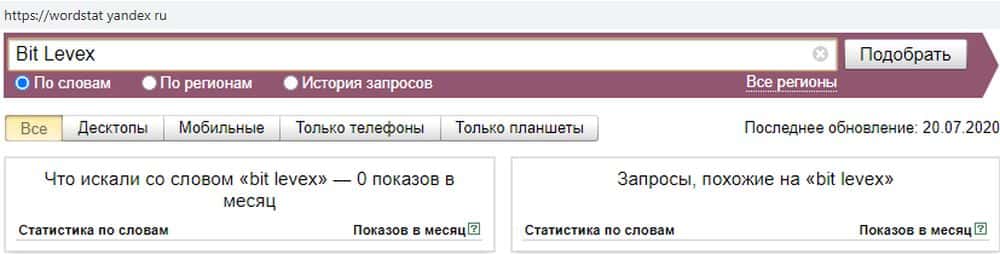 Веб-сервис Яндекс.Вордстат показывает, что по запросу "Бит Левекс" в поисковой системе Яндекс за последний месяц обращались всего 1 раз - криптоафера BitLevex пока не популярна.