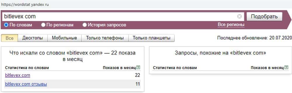При запросе "bitlevex com" показов 0. Возможно, каталы Бит Левекс решили не отвлекаться от русскоязычной аудитории, поэтому трейдерам из СНГ нужно соблюдать осторожность.