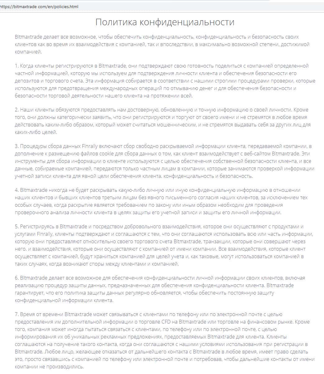 На сайте кидал BitmaxTrade предоставлена информация о политике конфиденциальности, где необходимо внимательно читать каждый пункт, потому как там ясно написано что клиенты обязуются предоставлять им достоверную, обновленную и точную информацию о своей личности.