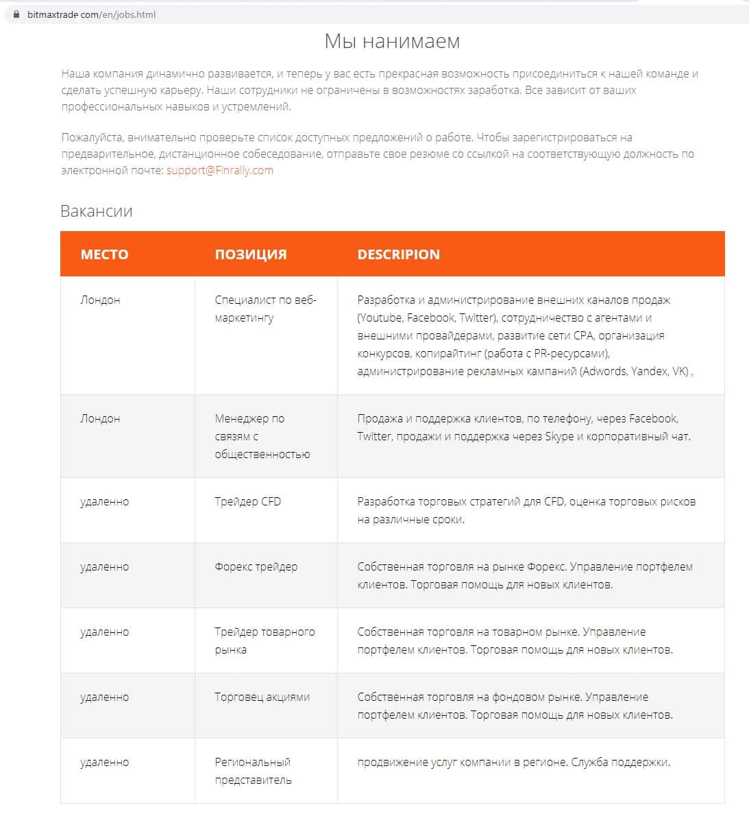 У мошенников BitmaxTrade имеются вакансии на официальном сайте