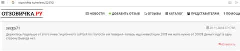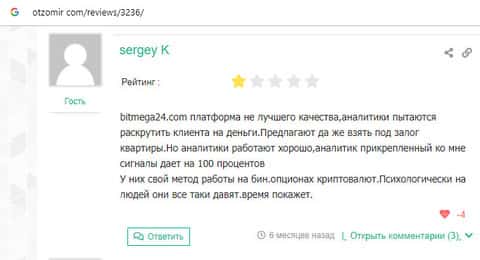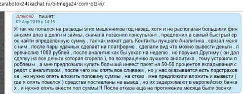 Отзыв указан на одном из интернет-ресурсов в виде комментария к подробному описанию мошенников BitMega24. Человек вложил 200 долларов на счет открытый там, а в итоге аферисты требуют вложить еще до 3000 долларов, иначе работать они с ним не будут и не отдадут деньги вообще.