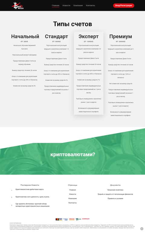 Ну и конечно же, во второй части интернет-ресурса BitMega24 можно заметить, как жулики предлагают вложить в разные типы счетов от 200 долларов до 30 000 долларов. Это больше похоже на завлекуху с интернет-хайпа, которая зарабатывает на лохах и живет за счет новых пополнений.