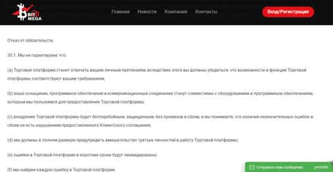 По поводу клиентского соглашения, он же Договор конторы BitMega24, здесь все очень печально и мы советуем обратить внимание на раздел Отказ от обязательств, где мошенники не гарантируют исправность Торговой платформы и в случае ее сбоя, не будут нести никакой ответственности за убытки пользователя.