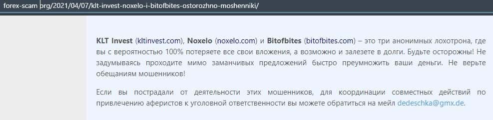 В следующей публикации мы можем отметить связь лохотрона Бит Оф Битес с другими подобными конторами, а именно КЛТ Инвест и Ноксело. Это мошенники кидающие людей.