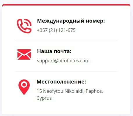 Далее представлены контактные данные мошеннической конторы Бит Оф Битес, где указан адрес регистрации лохотрона, электронная почта и номер телефона. Вот собственно сведения: