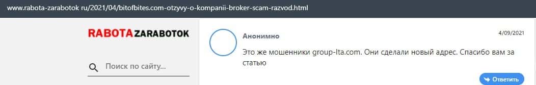 Человек в своем отзыве указал, что мошенническая контора BitOfBites является связанной с конторой Групп ИТА, так как имеют одного хозяина и проекты очень похожи по своей сути.