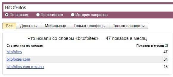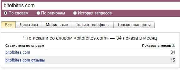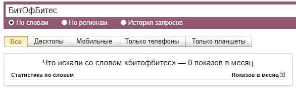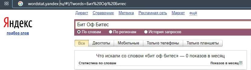Что касается бренда мошенников "БитОфБитес" в другом виде, то здесь такая же ситуация согласно системе Яндекс.Вордстат.
