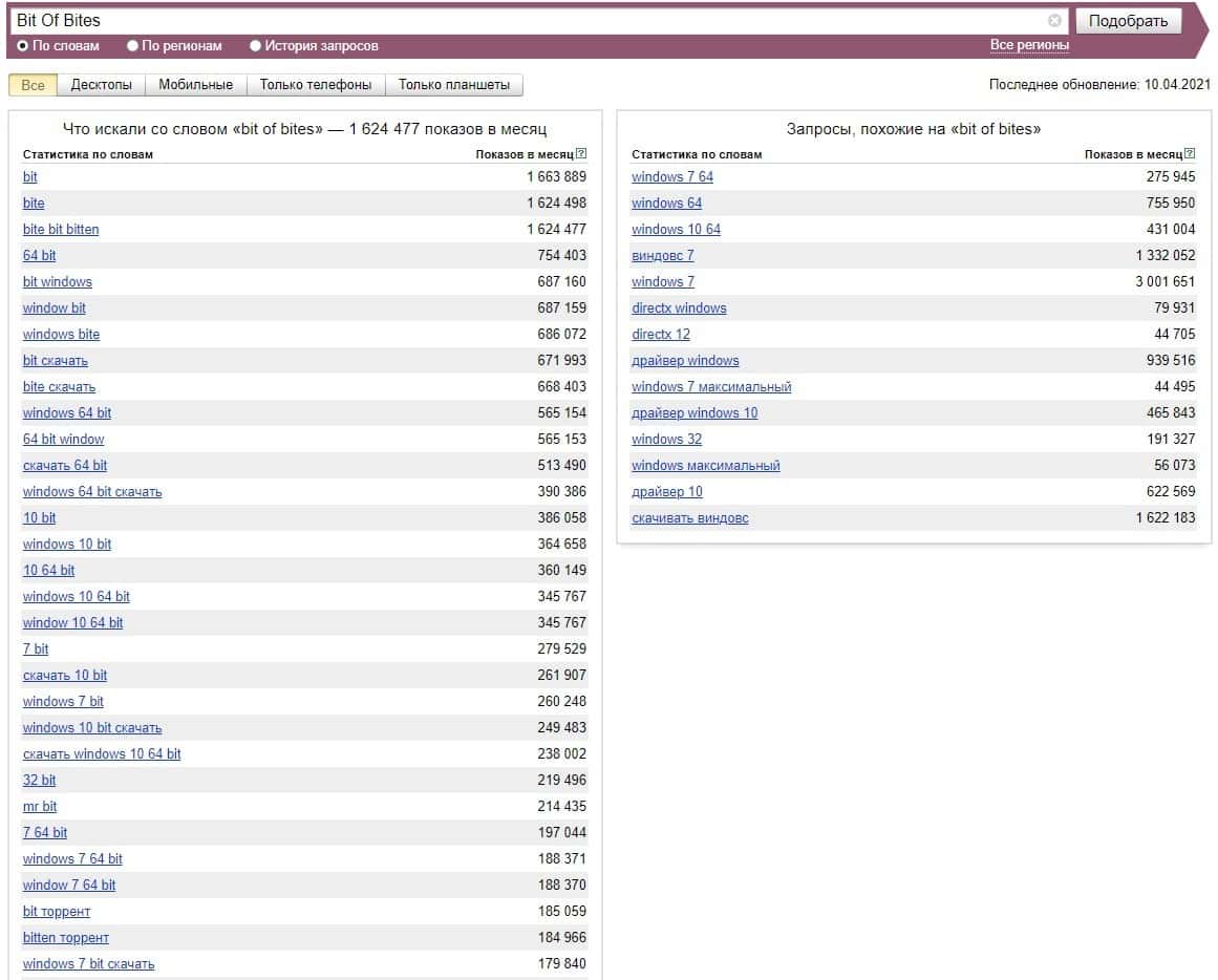 Другая версия бренда "Bit Of Bites", набрала уже намного больше показов в поиске Яндекс и она составляет около 1 500 000 показов в месяц из-за своего названия.