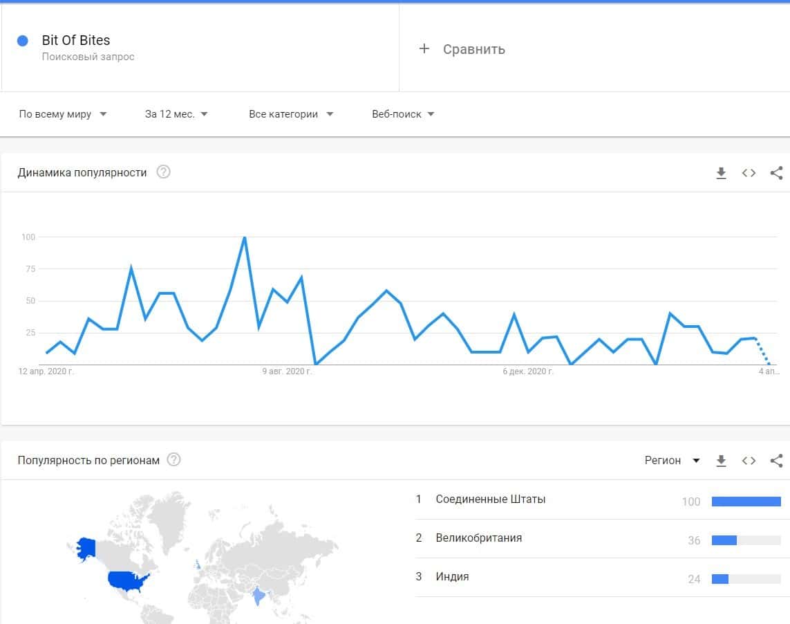 А вот о запросе бренда "Bit Of Bites" есть что сказать, так как они недавно даже были популярными и в основном запросы шли из США, Великобритании и Индии.