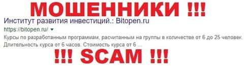BITOPEN - мошенническая организация, которая занимается завлечением клиентов на форекс-рынок через обучение и передает в лапы другой форекс-конторе. Мошенники работают слажено и данная компания выступает как посредник между клиентом и брокером и соответственно зарабатывает процент от вкладов. Как бы хорошо себя не представляли эти лохотронщики, они работают на форекс-мошенников и помогают им отбирать деньги у наивных людей.