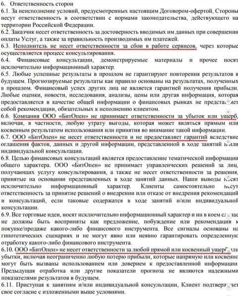 В клиентском соглашении, которое предоставила компания Бит Опен четко прописана ответственность сторон и ни в одном пункте контора не берет на себя ответственность, а все возлагает на клиента. Клиент, как лох, подписывая данный договор отвечает за убытки, которые натворят аналитики и советчики на его счете. Поэтому перед подписанием договора почитайте внимательно его и подумайте нужно ли вам это, тем более согласно пунктам информация на сайте не является достоверной, в том числе и сам договор. А это одна из хитрых фишек, которой аферисты пользуются, когда дело пахнет жареным.