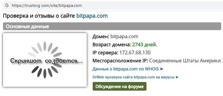 Проверка веб-сервиса обманщиков Бит Папа на trustorg com показала, что возраст домена к моменту написания статьи составляет 2743 дня, вероятнее всего домен купленный.