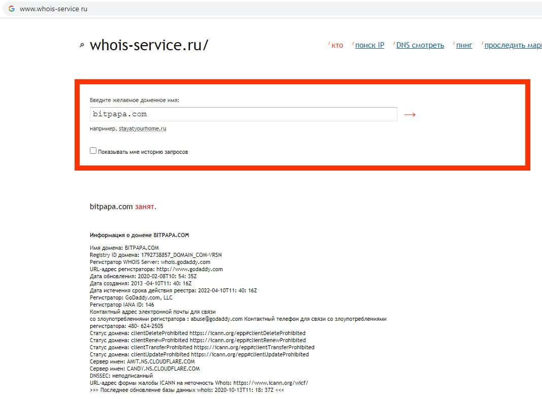 - Информация о домене онлайн-ресурса мошенников Бит Папа