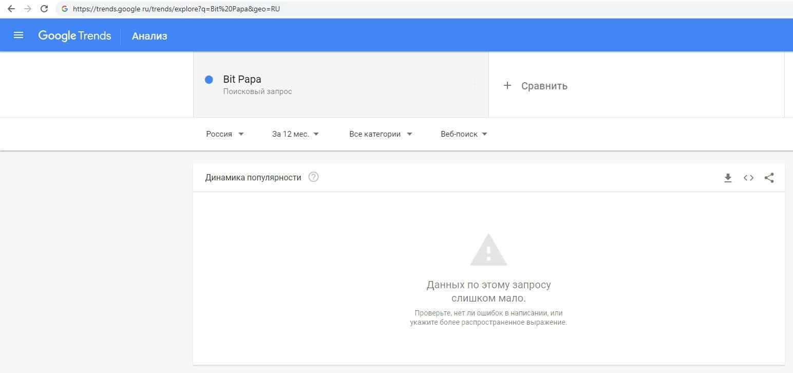 О количестве брендовых запросов названия компании на русском языке без пробела "БитПапа" на Гугл Трендс нет никакой информации.