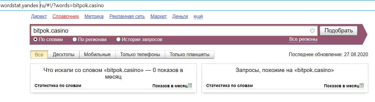 Количество запросов по доменному имени "bitpok casino", написанного с пробелом, по данным сервиса Яндекс Вордстат, равно такой же цифре - 0 показов.