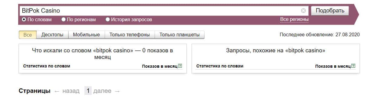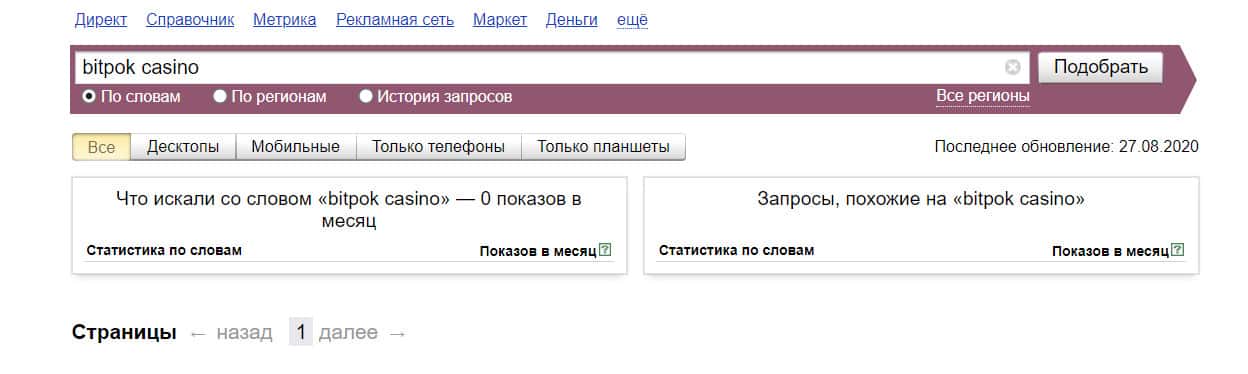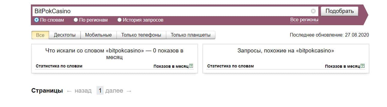 Название бренда "BitPokCasino" на английском языке пользователи совсем не искали в системе Яндекс: 0 показов за месяц.