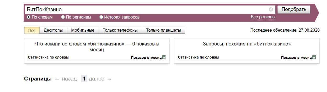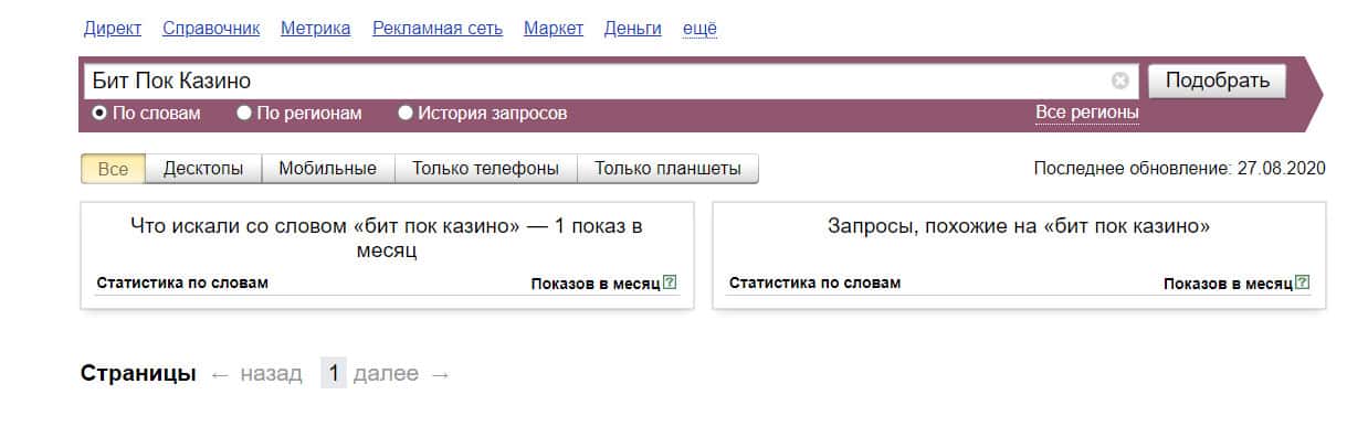 Название бренда "Бит Пок Казино" на русском языке люди совсем не искали в системе Яндекс, результат равен нулю.