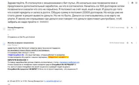 В своем письме человек рассказал, как он решил попробовать улучшить свое финансовое положение, а улучшил его для форекс-конторы Бит Пульсес. Мошенники развели его на 25 000 долларов и чтобы вернуть все обратно, его уговорили знакомые написать в службу ChargeBack.Me которые разбираются в таких ситуациях.