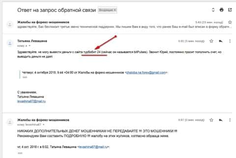 Старые аферисты, имена которых уже на дурном слуху, начали скрываться под новыми названиями и вести мошеннические действия. Брокерская контора Турбобит 24 теперь работает с новым сайтом и позиционирует себя как BitPulses. Лохотронщики, как и раньше, заманивают своих клиентов и отбирают последнее. Девушка жалуется на то, что звонит некий звонарь Юрий, который работает в данной кухне, и постоянно просит пополнить счет, но выводить деньги не разрешает. И скорее всего жертве этого сделать не удастся, потому что это налаженная схема аферистов, которая практически всегда работает.