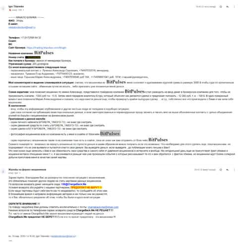 Мошенники BitPulses звонили со следующих номеров: +74997032140, +74993504507, а также приходило электронное письмо от Шамиля Босаева [email protected]