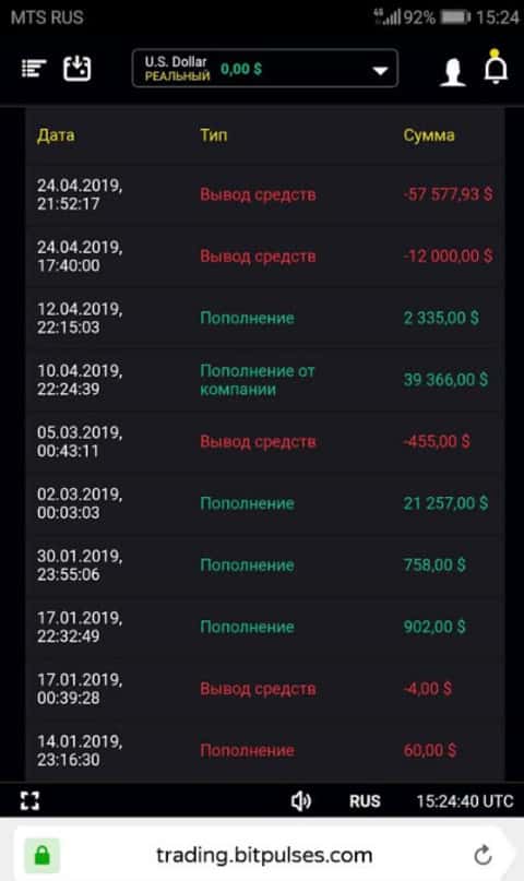 Шарлатаны Бит Пульсес обворовали своего очередного клиента на небольшую, но очень неприятную сумму в размере 110 долларов. Схема развода началась со звонка звонаря брокерской конторы Артема, который представился успешным трейдером и стал разводить клиента на внесения денежных средств для их приумножения. После того, как жертва отправил деньги мошенникам, его торговый счет передали Ивану, который был аналитиком и в его обязанности было обучение клиента и зарабатывание денег. Через время позвонил Николай из финансового отдела конторы BitPulses и сказал, что нужно срочно вложить больше денег для сделки всей его жизни. Но по итогу все было слито без объяснения причины.