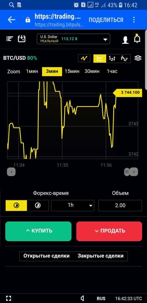 На следующем сриншоте мы можем увидеть торговый терминал через мобильное приложение Бит Пульсес. На данный момент на счету лежит коло 100 долларов, которые клиент не может снять.