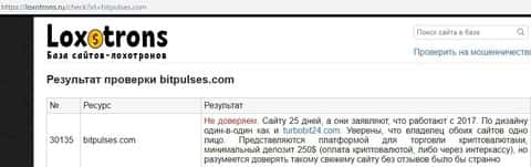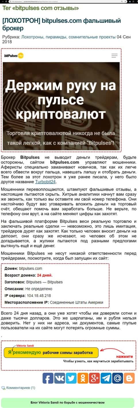 На одном из популярных сайтов об интернет-заработке в блоге была размещена небольшая статья о признаках кухонности Бит Пульсес. Мошенники до этого занимались своей воровской деятельностью под другим названием Turbobit24, которая уже давно имеет репутацию черного брокера. Аферисты штампуют положительные отзывы о себе проплачивая каждый отдельно. Они работают по той же схеме, что и форекс-аферисты. Сначала вы оставляете свой номер для связи, потом звонари начинают названивать вам каждый день и умолять положить деньги на счет, а если вы согласитесь, то теперь вы им звонить будете, а они не будут отвечать. Фальшивые котировки, фальшивая платформа - все это для облапошивания клиентов. Их сайт был запущен 24 дня назад (на 04.09.2018), хотя позиционируют свою работу с 2017 года. Также нет регистрации компании и никаких документов. Не ведитесь на лохотронщиков. Наш вывод: контора Бит Пульсес - SCAM!!!