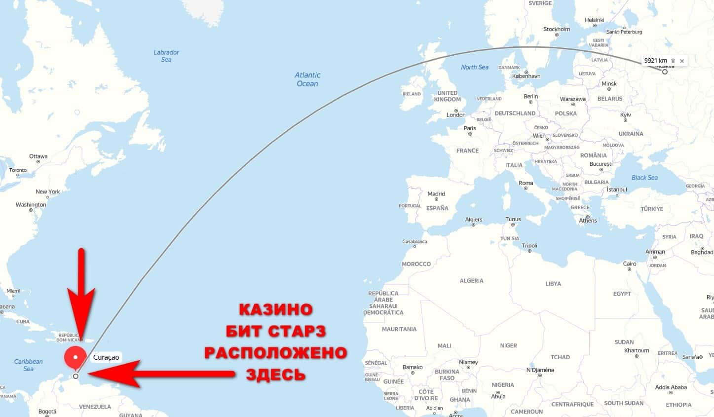 Далее представлено реальное местоположение этого мошеннического онлайн-казино Бит Страз, которое ведет деятельность с оффшорного острова Кюрасао.