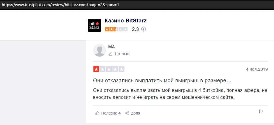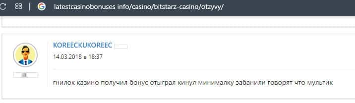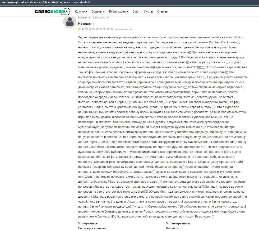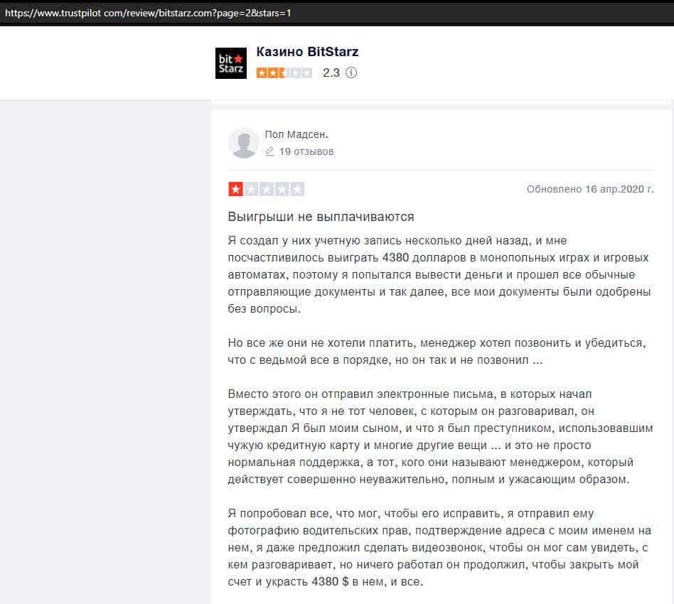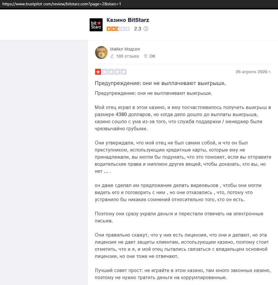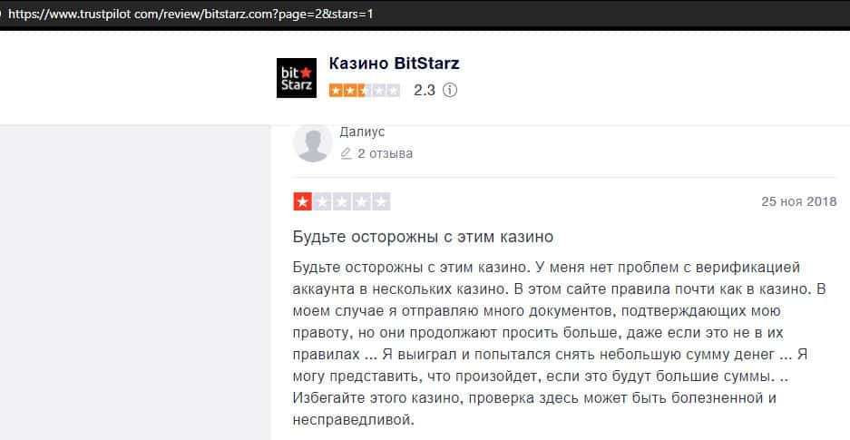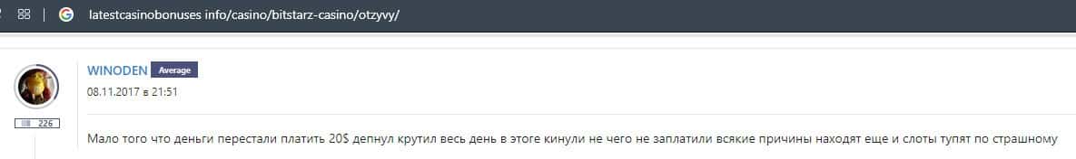 Пользователь сети указал, что контора BitStarz не выплачивает выигрыши ни под каким предлогом. При чем такая ситуация уже случилась у многих успешных игроков.