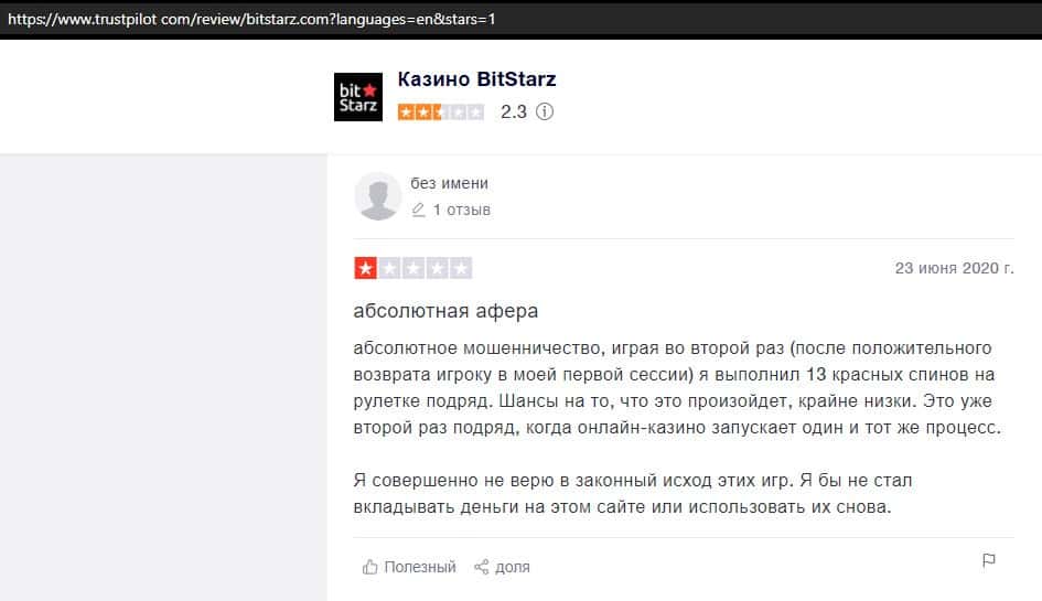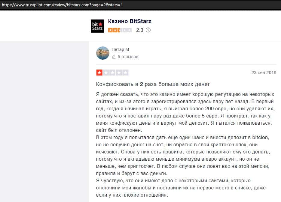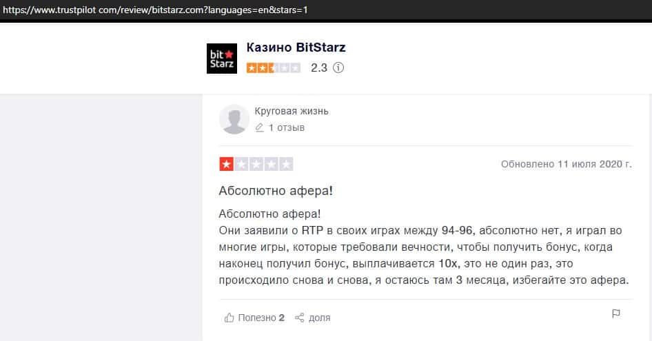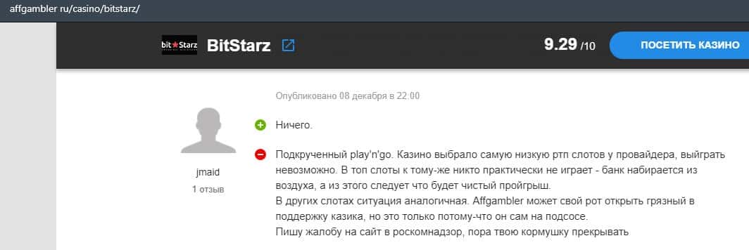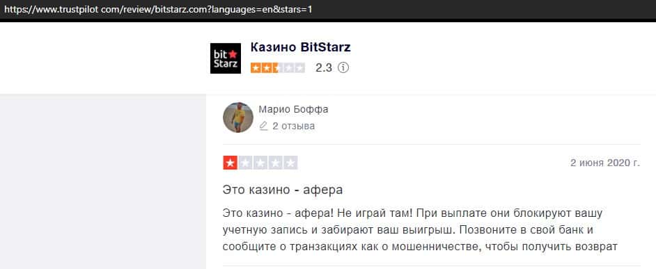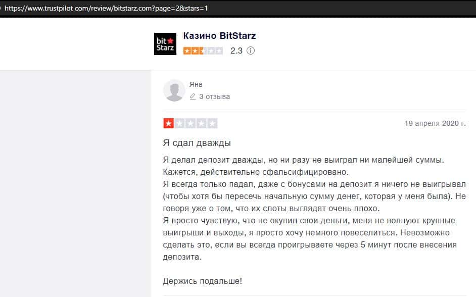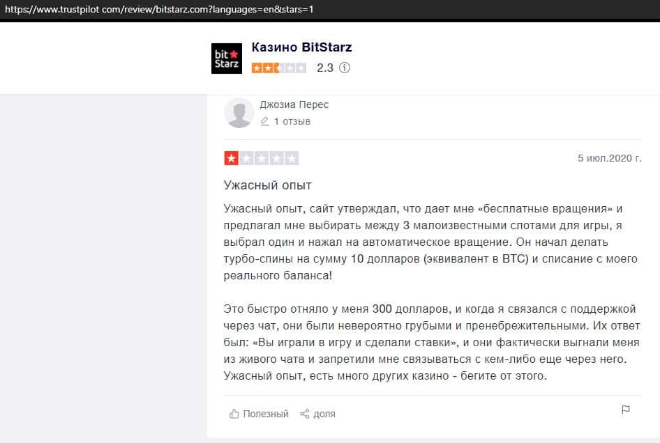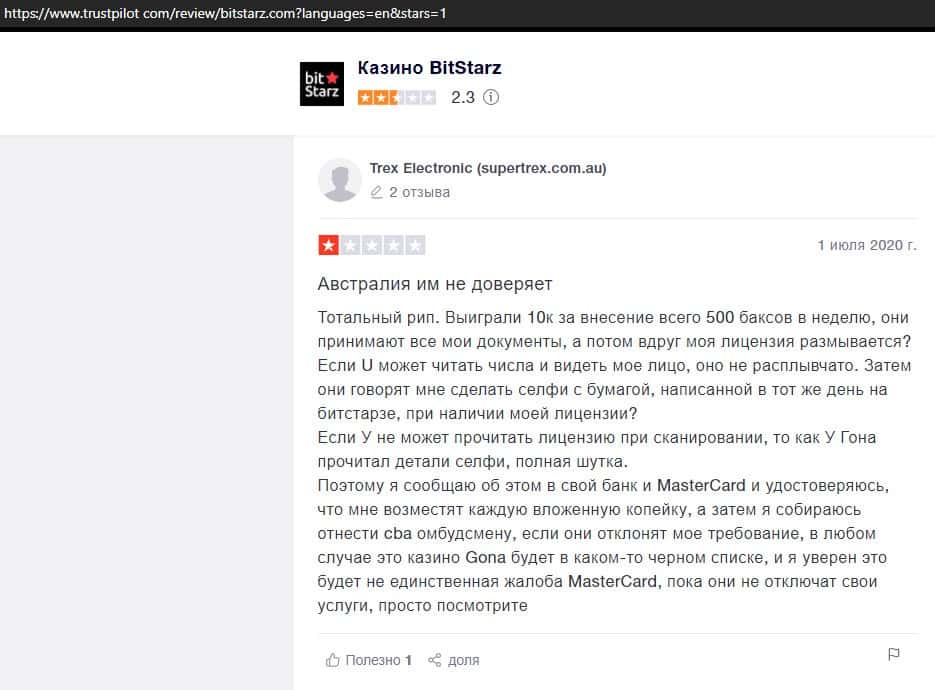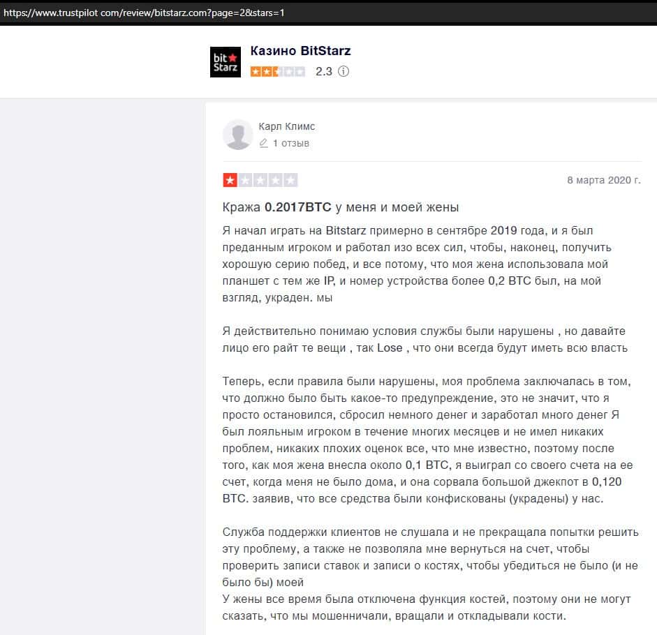 Клиент жалуется в своем отзыве на то, что вывести с псевдо-казино BitStarz практически невозможно. Поэтому лишний раз по такому поводу рисковать не нужно.