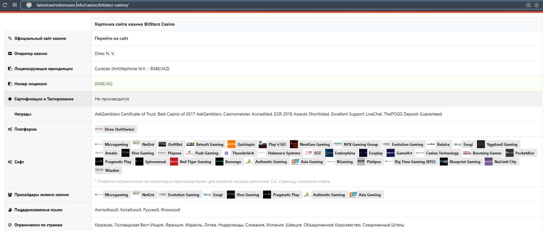 О юридическом лице, которое владеет конторой BitStarz пришлось искать информацию на сторонних ресурсах. Владельцем оказалась компания Direx N V зарегистрированная в Кюрасао.