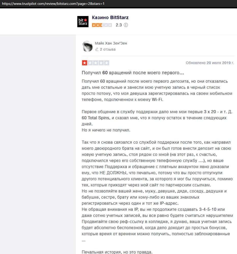 Человек пробовал играть в казино Бит Старз несколько раз и все у него были проблемы с бонусами. это привело к тому, что его перестали обслуживать из-за не отработки этих бонусов.