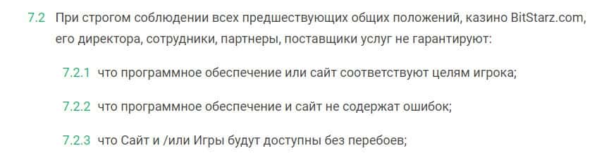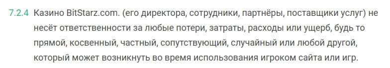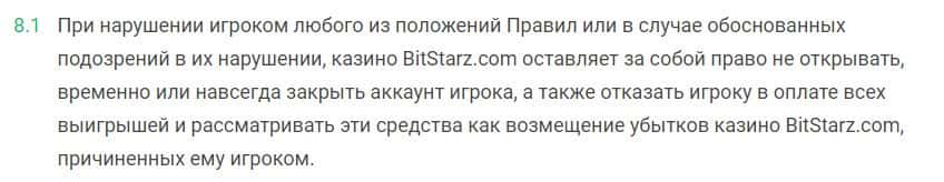 Ниже описывается, что есть вероятность что клиент нарушит правила и должен понести за это соответствующее наказания. А вот про свои косяки контора BitStarz не пишет вообще.