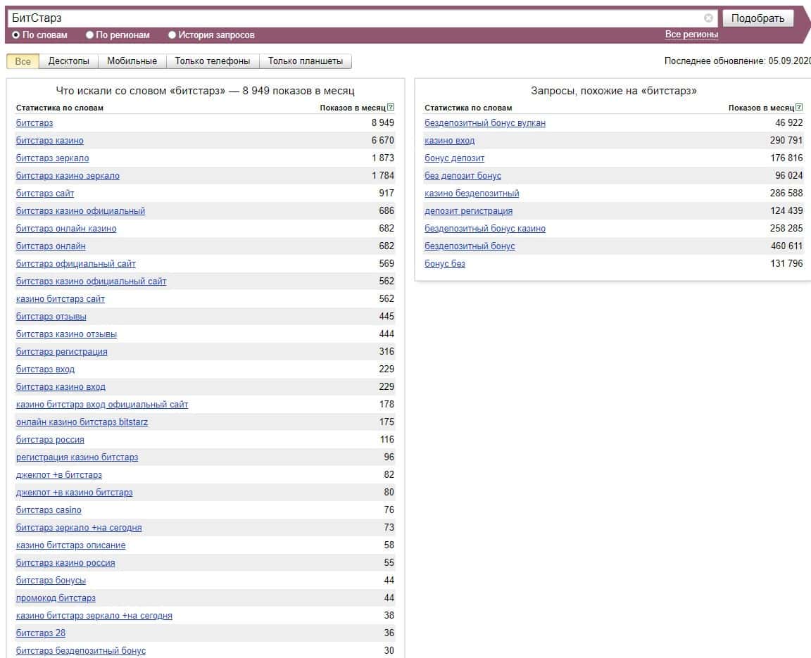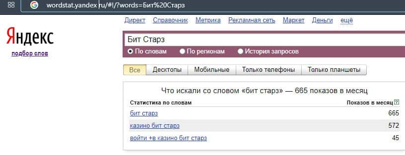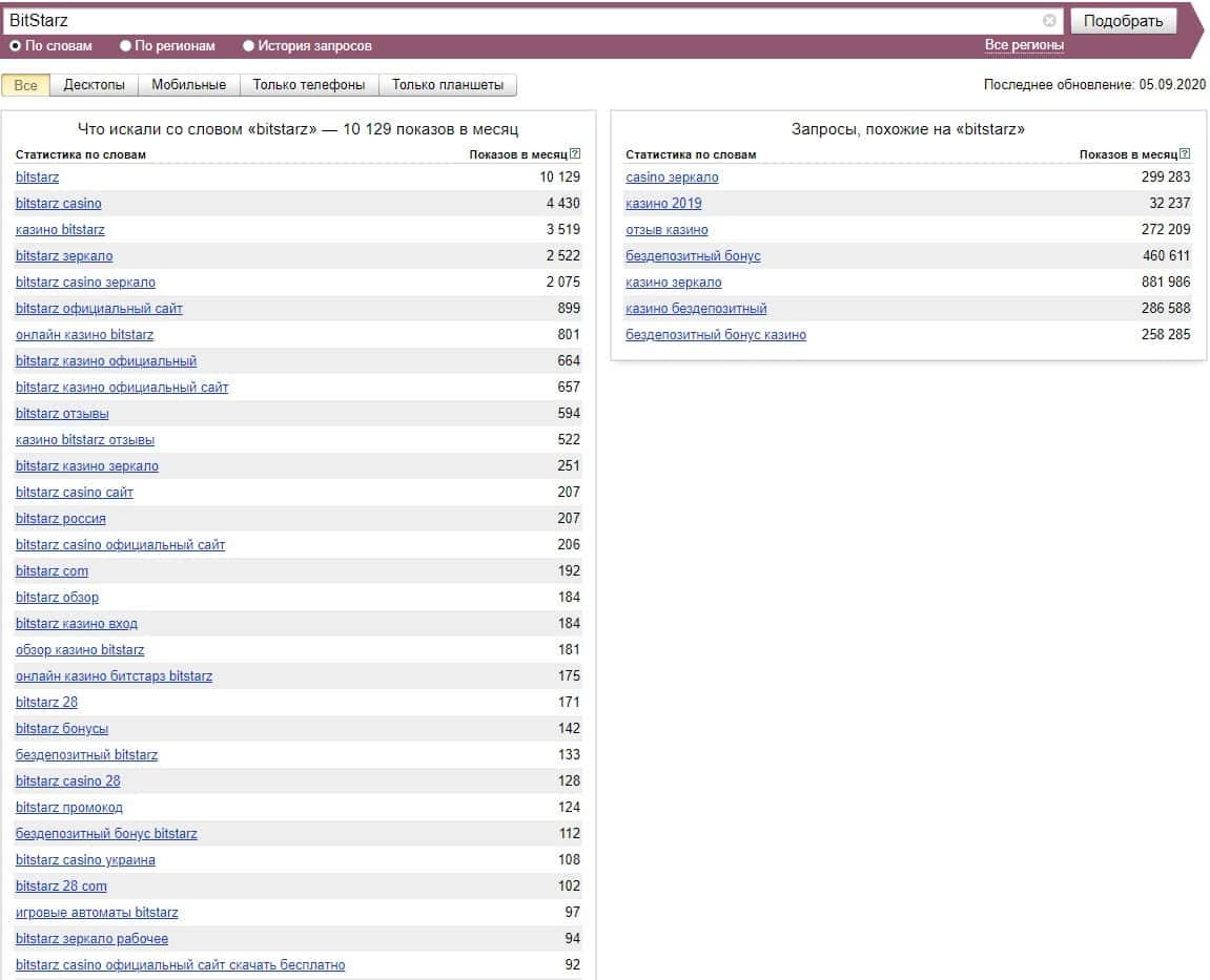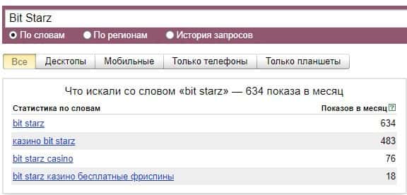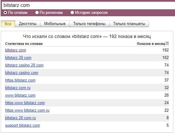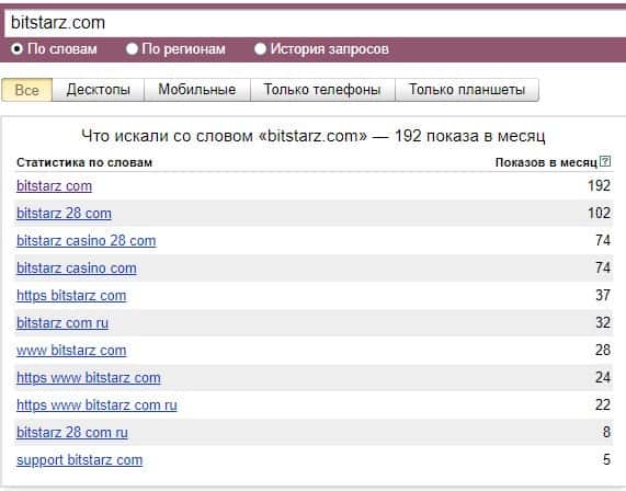 Если ввести в проверку сайт конторы без точки "bitstarz com", то система выдает 192 показа за последний месяц по версии Яндекс Вордстат.