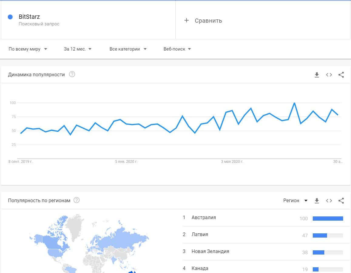 По поводу запроса бренда "BitStarz", шулерская организация набрала особую популярность, и динамика запросов в основном исходит из Австралии, Латвии и Канады.