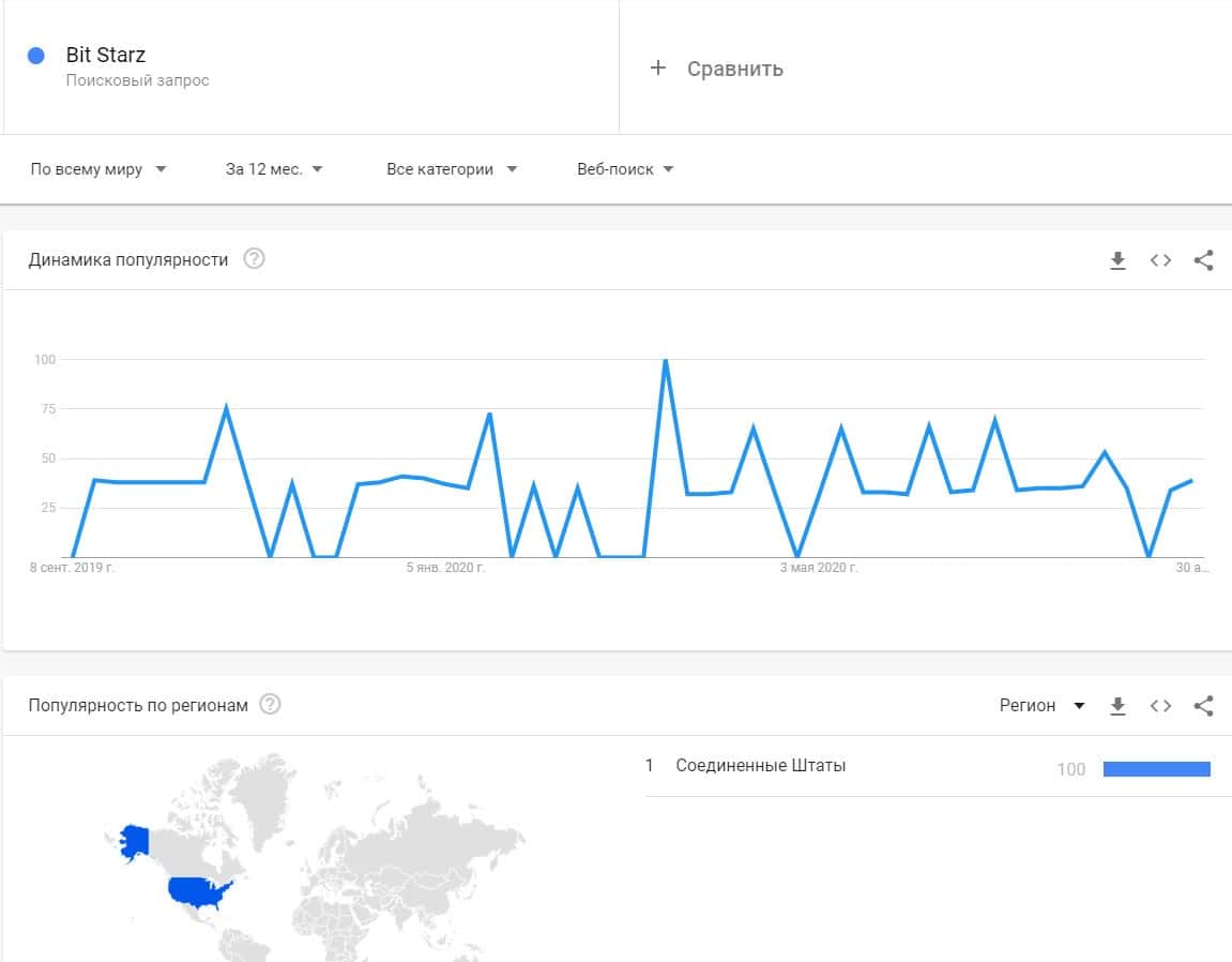 Что касается запроса бренда "Bit Starz", то здесь есть кое-какие запросы и в основном это трафик из Соединенных штатов Америки, так как именно там они популярны.