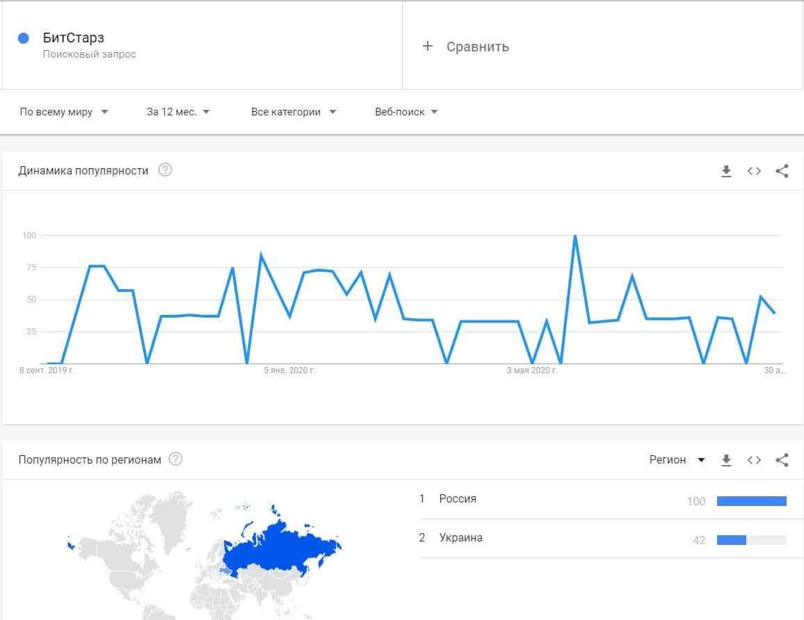 Что касается запросов по бренду "БитСтарз", то здесь есть информация по запросам по версии Гугл Трендс и в основном они идут из России и Украины.