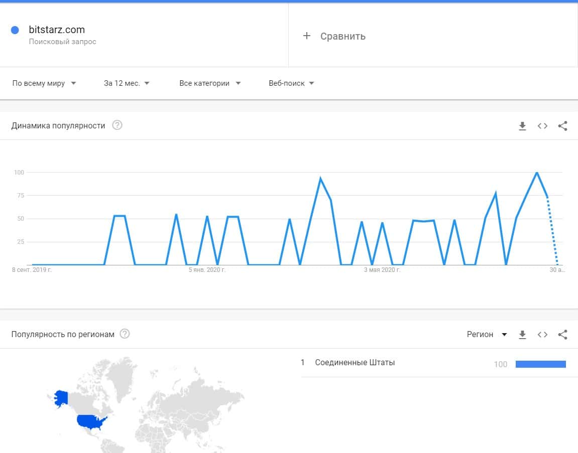 Ну и конечно же ситуация с изменением запроса с точкой "bitstarz.com" по версии Гугл Трендс находится в кое-каком спросе и в основном запросы шли из США.