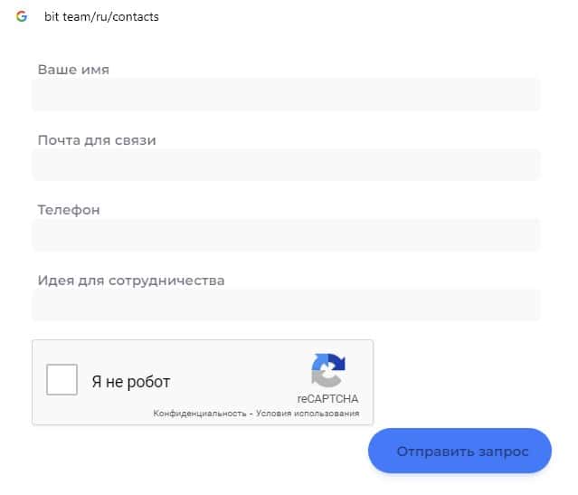 Жулики Bit Team предлагают пользователям заполнить бланк обратной связи, где просят указать свое имя, адрес электронной почты и номер контактного телефона.