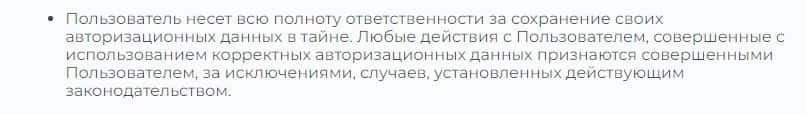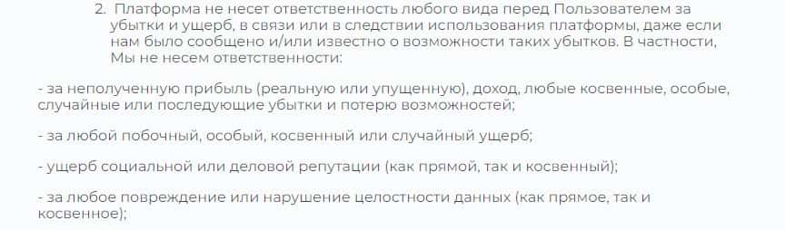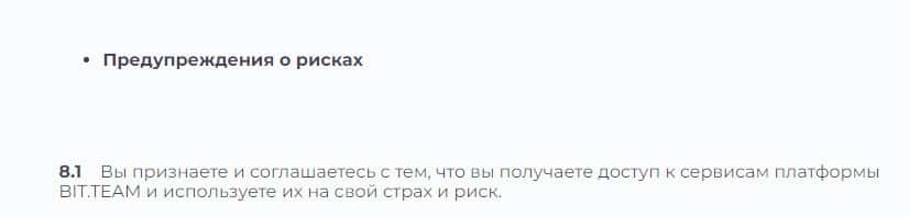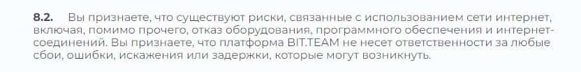 Согласно тому, что мошенники пишут в соглашении, компания Бит Тим не несет никакой ответственности за не полученную прибыль клиентом, а также за возможные убытки.