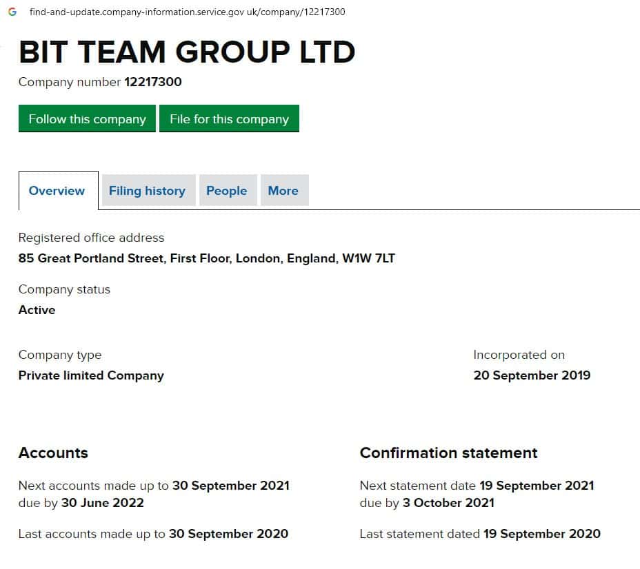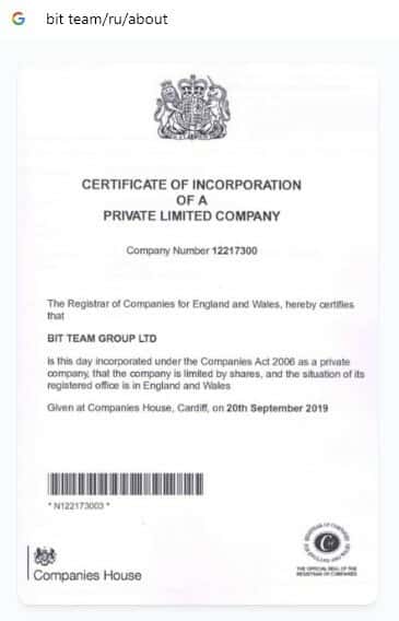 На официальном сайте реестра компаний Великобритании beta companieshouse gov uk есть информация о шараге Bit Team, которая не дает никаких гарантий.