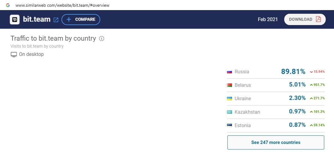 При проверке посещаемости интернет-ресурса скам-организации Bit Team на similarweb com оказалось, что среди трафика есть пользователи из постсоветского пространства.