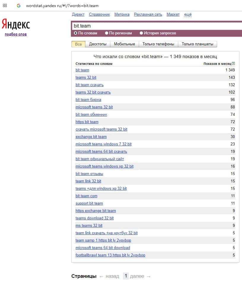 Количество брендовых запросов название домена компании "bit.team" на Вордстарт Яндекс Ру составило 1349 показов за месяц.