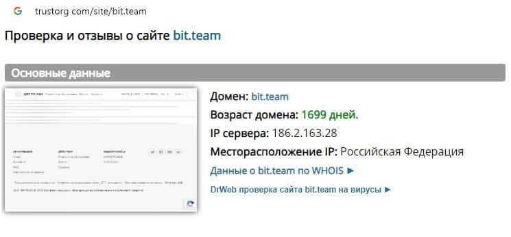 Проверка интернет-сервиса аферистов Бит Тим на trustorg com показала, что возраст домена к моменту написания статьи составляет 1699 дней, скорее всего домен купленный.
